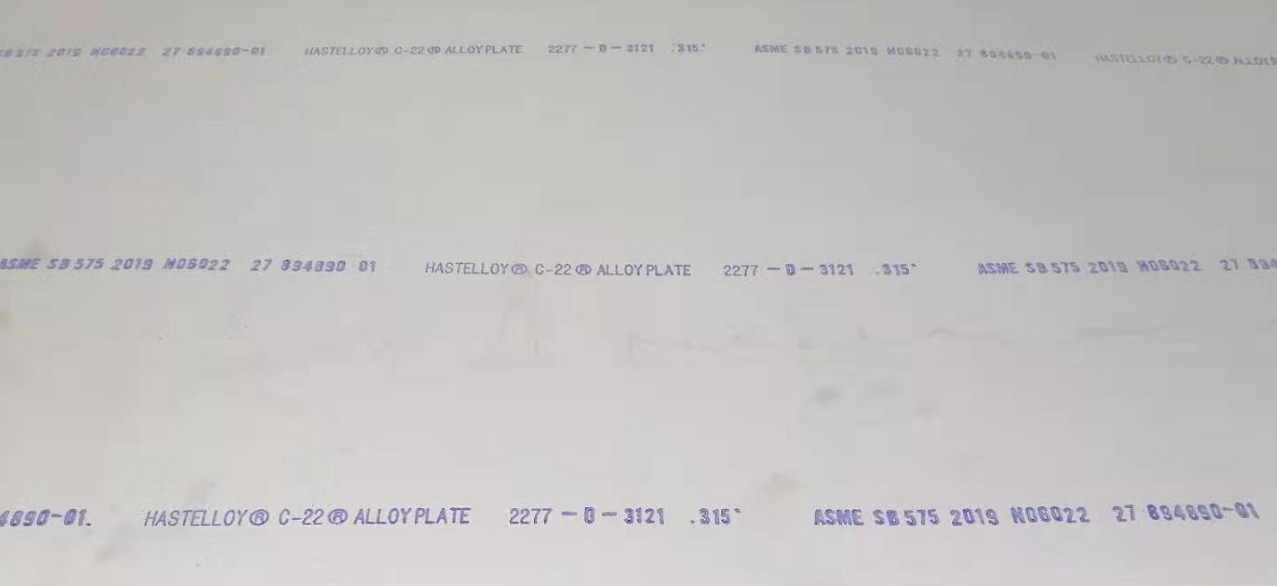 碳(C)≤0.015,錳(Mn)≤0.50,鎳(Ni)≥56,硅(Si)≤0.08,釩(V)≤0.35,硫(S)≤0.02,鉻(Cr)20.0~22.5,鐵(Fe)2.0~6.0,鉬(Mo)12.5~14.5,鎢(W)2.5~3.5,鈷(Co) ≤2.5